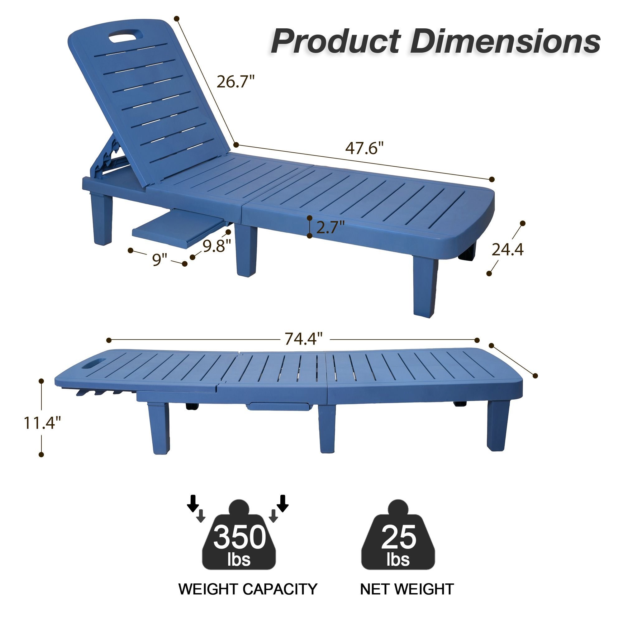 1.Adjustable Backrest & Pull-Out Tray: The outdoor chaise lounge has 4 level adjustable backrest, which can be quickly adjusted to your most comfortable position. There is also a pull-out side tray under the recliner. The hidden tray allows drinks to be within your reach.