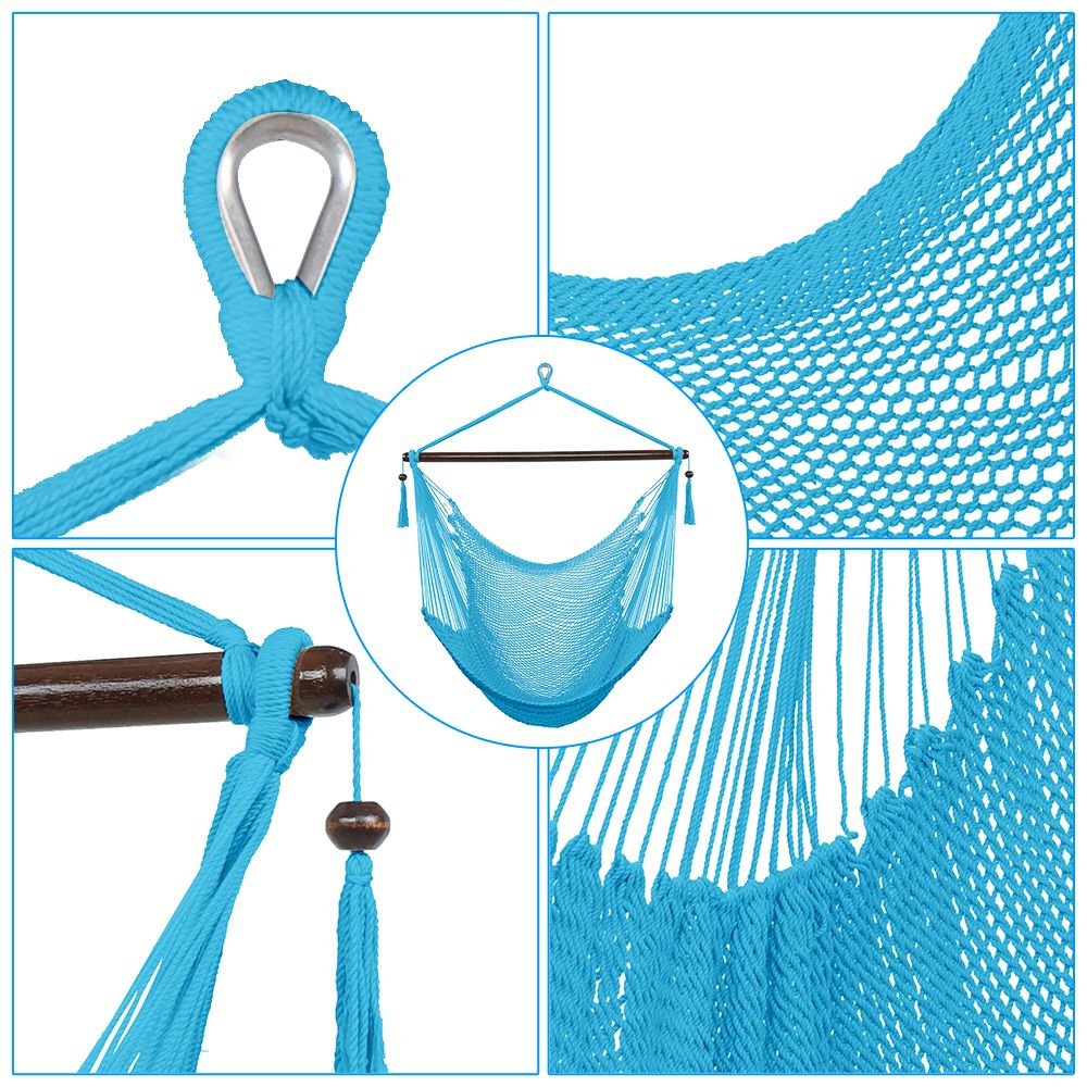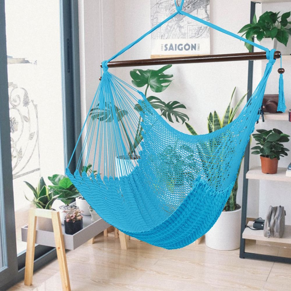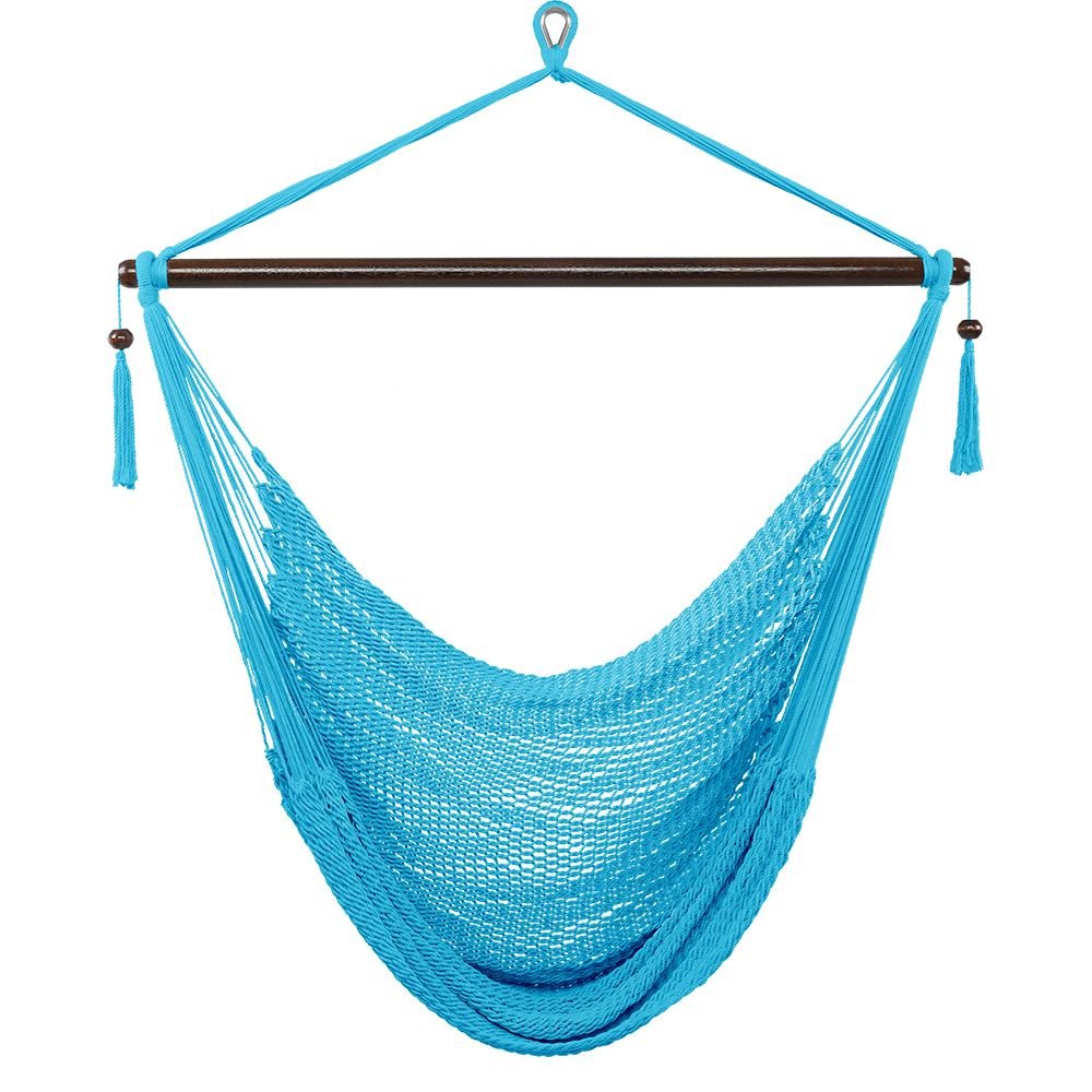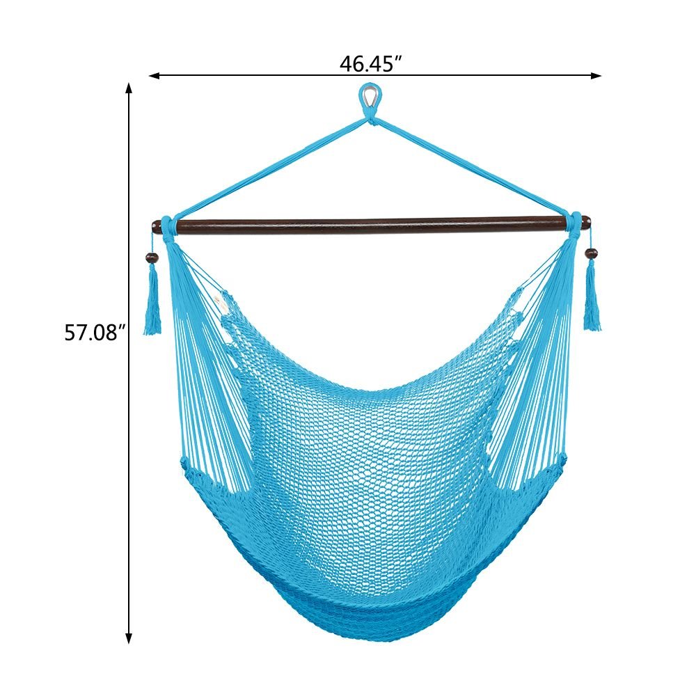 Tightly woven from soft-spun polyester ropes, this Caribbean Large Hammock Chair is not only soft and comfortable but also weather durable. The wide 46" spreader bar holds the chair open to the perfect width, keeping the hammock sturdy while allowing for an even disbursement of weight to withstand up to 7.7lbs of load. It is also easy to set up. You can hang it onto trees, porches, porches, fun rooms or a separately sold hanging chair frame. Swinging tassels on the bar add a touch of simple elegance to the whole design.