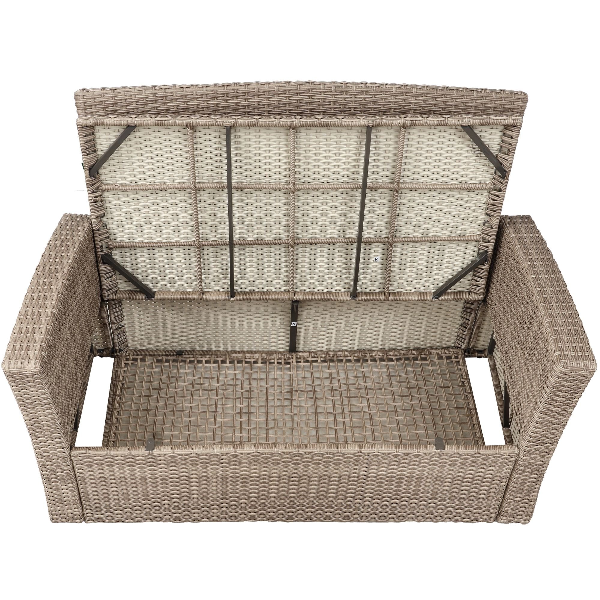 Add a quaint and relaxing nook to your outdoor space perfect for lounging, outdoor dining and more with this complete 4-piece rattan furniture set. Including one love seat, two sofa chairs with matching ottomans and a coffee table, this furniture set-up provides ample space for lounging with family or gathering with friends while enjoying the weather. Manufactured with tightly woven rattan in warm multi-tone taupe shades, the outer frame of each piece is designed to melt into natural outdoor surroundings seamlessly, acting as the perfect accent to your garden or patio. Crafted with premium materials, the inner powder-coated steel frame and rattan woven exterior are UV and water-resistant, making this furniture set well equipped to handle varying weather conditions. Conserve space when needed and tuck the matching ottomans underneath the sofas when they aren’t in use, or enjoy the storage area beneath the loveseat to keep outdoor essentials out of sight and in easy reach.