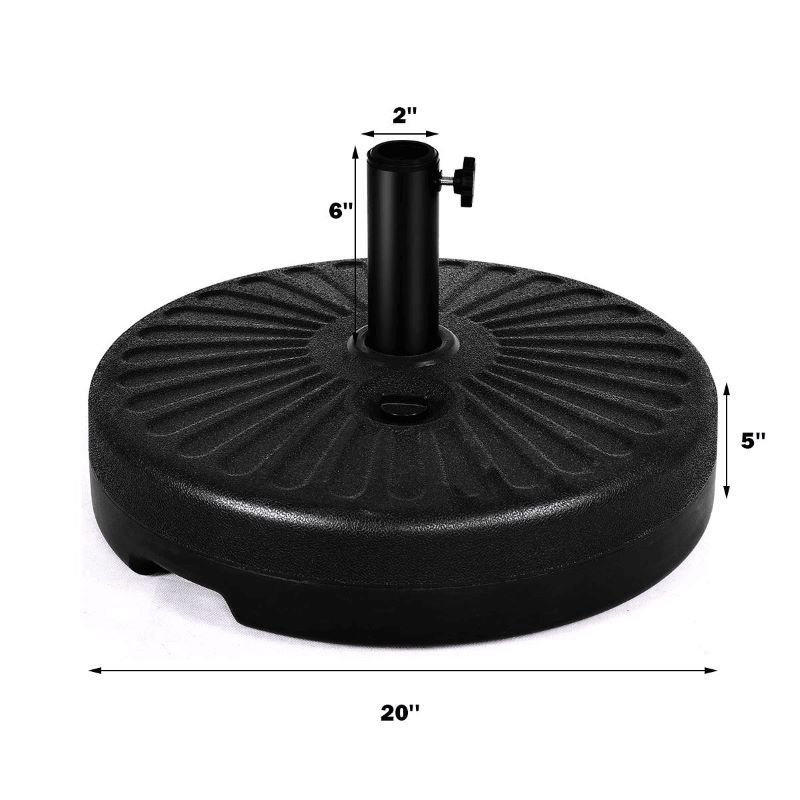 The base can be filled with water or sand; has a maximum weight of 50 pounds; and can be easily transported when emptied.