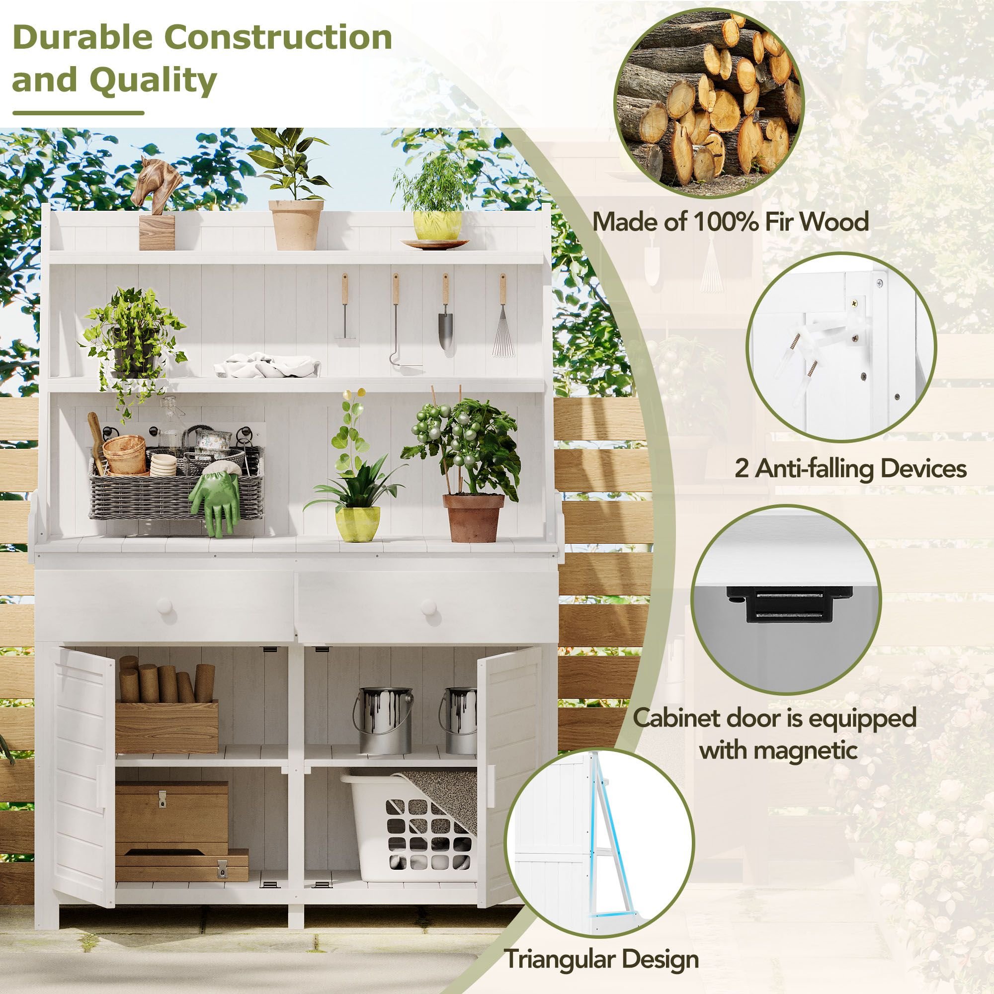 [Durable Construction and Quality] Made of 100% fir wood and featured with two triangle bars, its strong and sturdy construction ensures more stability, even when loaded with heavy pots and garden equipment. 2 anti-falling devices in the back is to fix the bench with the wall for better safety. Besides, the cabinet door is equipped with magnetic, providing a more silent and soft click while latching or closing, efficiently preventing dust and insects entering, and leading to longer lifespan for