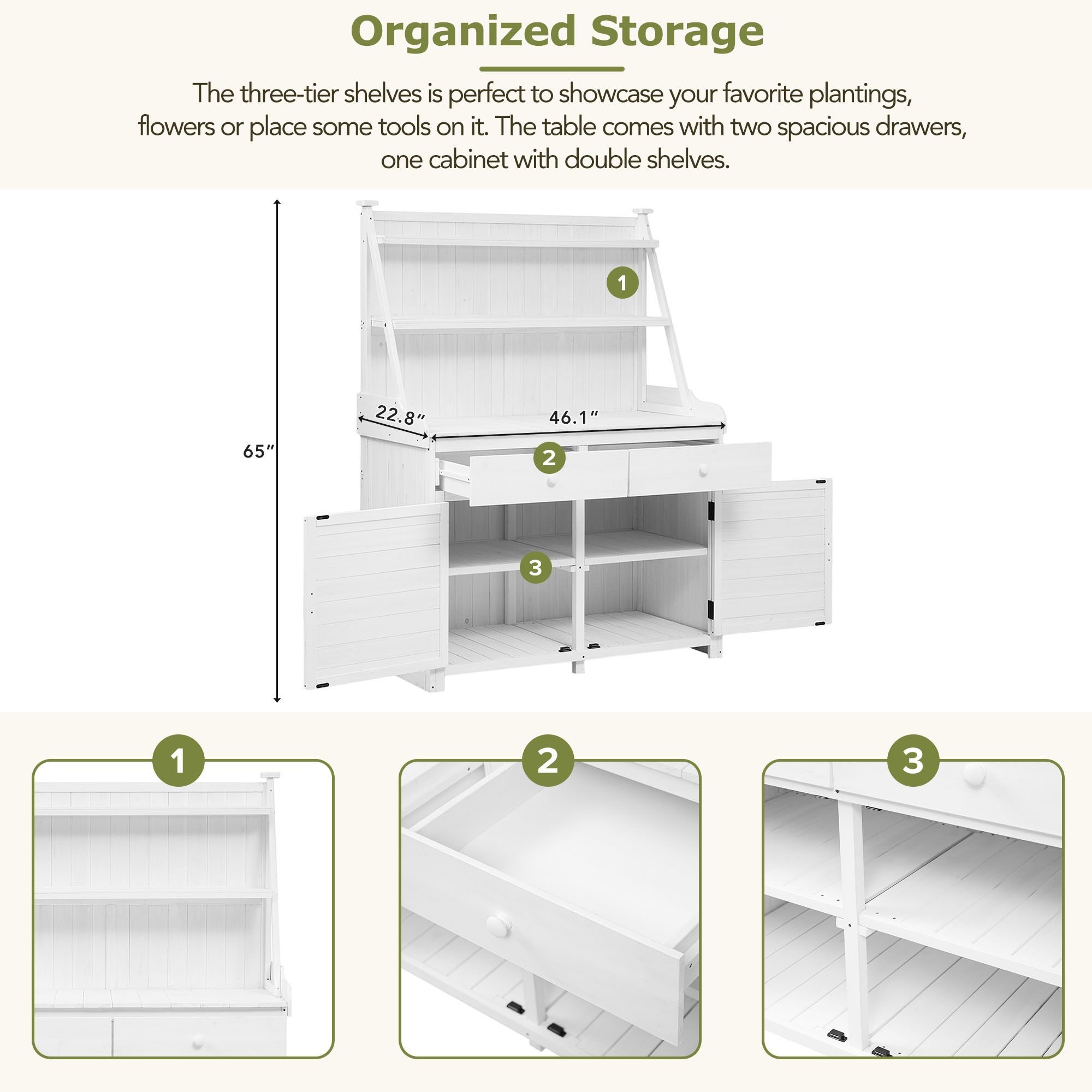 [Organized Storage] The three-tier shelves is perfect to showcase your favorite plantings, flowers or place some tools on it. The table comes with two spacious drawers, one cabinet with double shelves, as it provides ample storage space to separate different types of items into specific compartments, keeping everything well-organized and within reach.