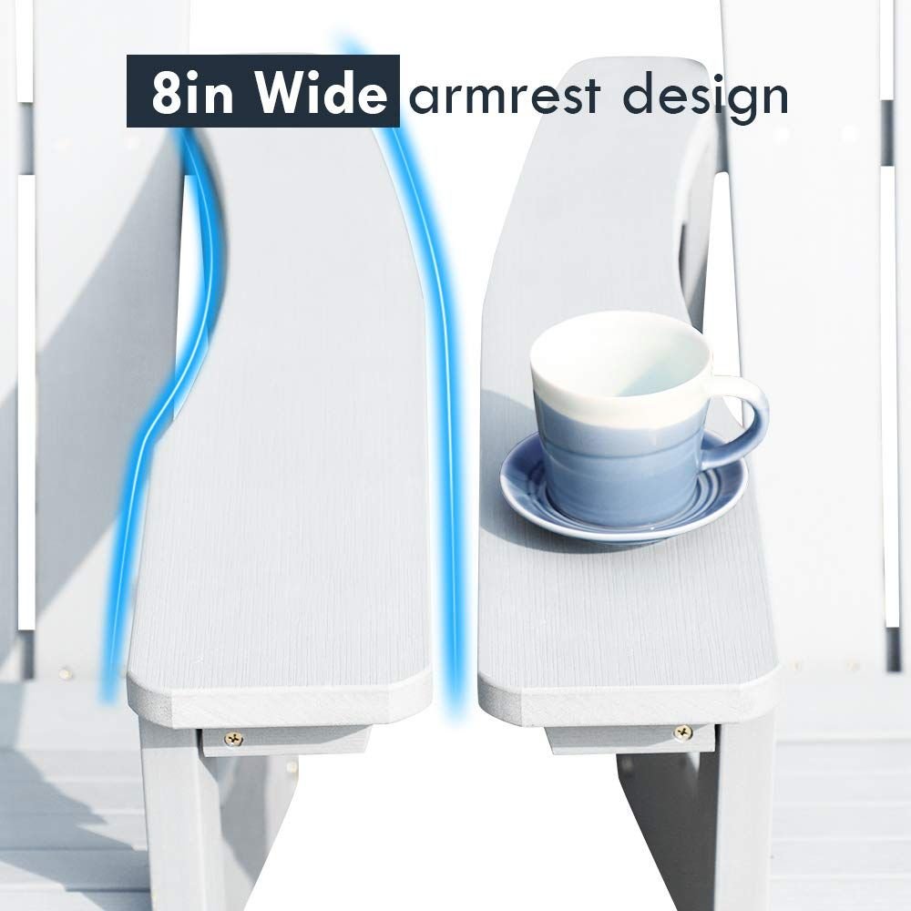 Product Material:This set of chairs is made of environmentally friendly new HIPS plastic composite material, weighing 30 pounds, adaptable to a variety of environments, and easy to clean.Product Size:The adirondack chair size is 35.4"L * 29.5"W * 36.6"H, chair width 19.7", armrests width 4.9". It's wide enough to seat, place cups and plates. The load capacity of these tall large plastic fire pit chairs is 350lbs. And the reclining outdoor adirondack chair is ergonomic to release spinal pressure and fatigue effectively.