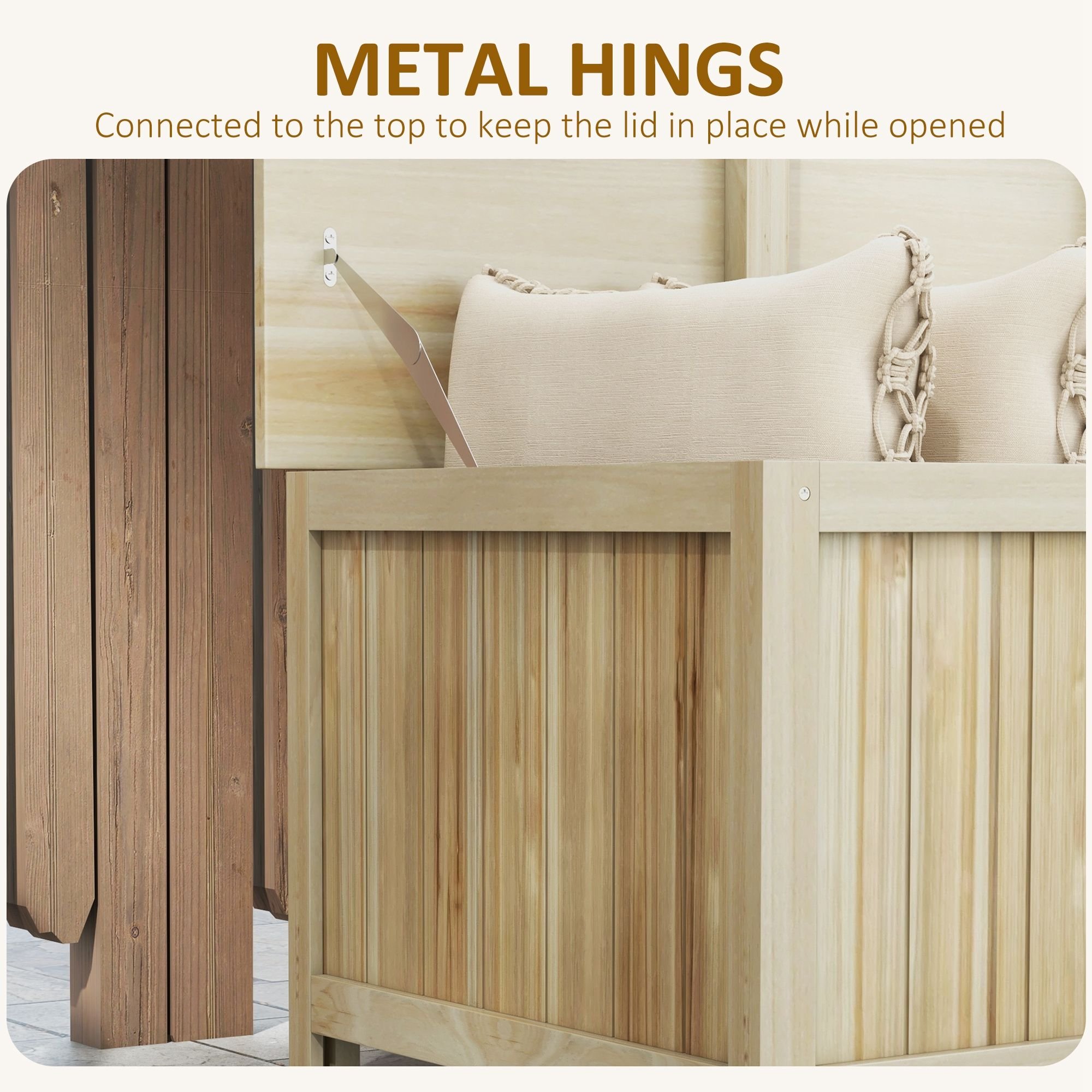 Easy to Open: Two metal hinges connect the top of our deck storage box to the base. They prevent wind, weight, and other issues from having it fall off while allowing a smooth and easy-to-open source of storage.