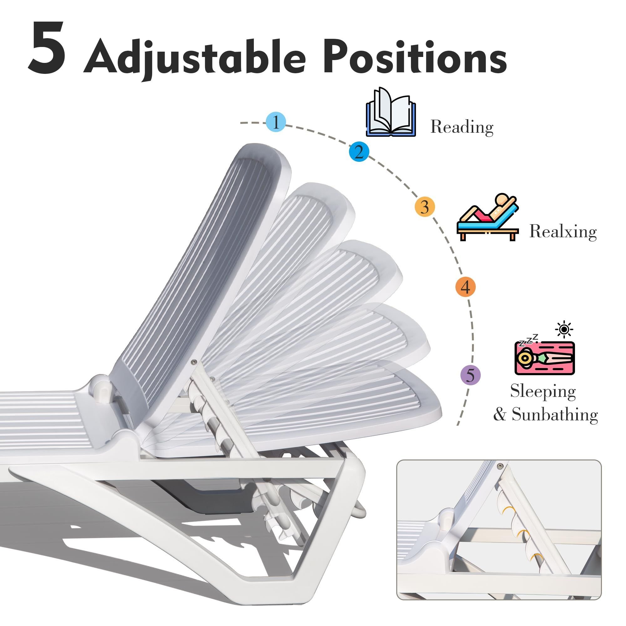 5 Adjustable Positions: The outdoor chaise lounge is equipped with 5-position adjustable backrests for ultimate relaxation, including a fully flat option. Different angles can meet your different needs for reading, resting, sleeping, sunbathing, etc.