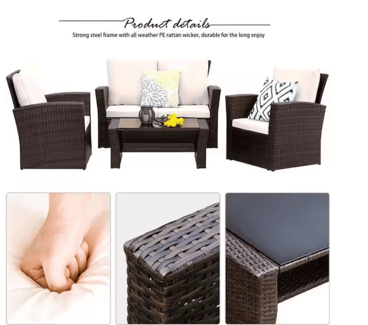 4-pieces set include - 1 x loveseat, 2 x armchairs,1 x coffee table with tempered glass top and 8 x cushions, (mix brown rattan with beige cushions, assembly required)