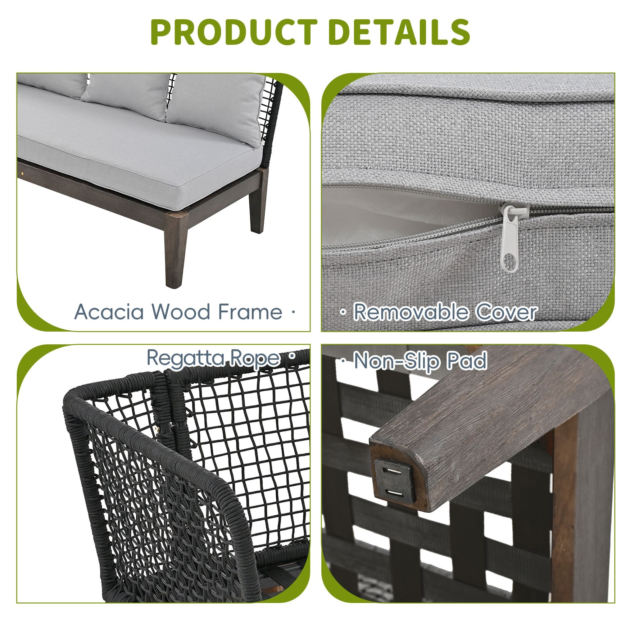 | Highlights | Sectional Sofa Set // Regatta Rope // Polyester&Foam Cushion // Acacia Wood Frame // Detachable Cushion // L-Shaped Sofa Set // Hand-Tied Ropes // Water-Resistant // 2 Colors Available |