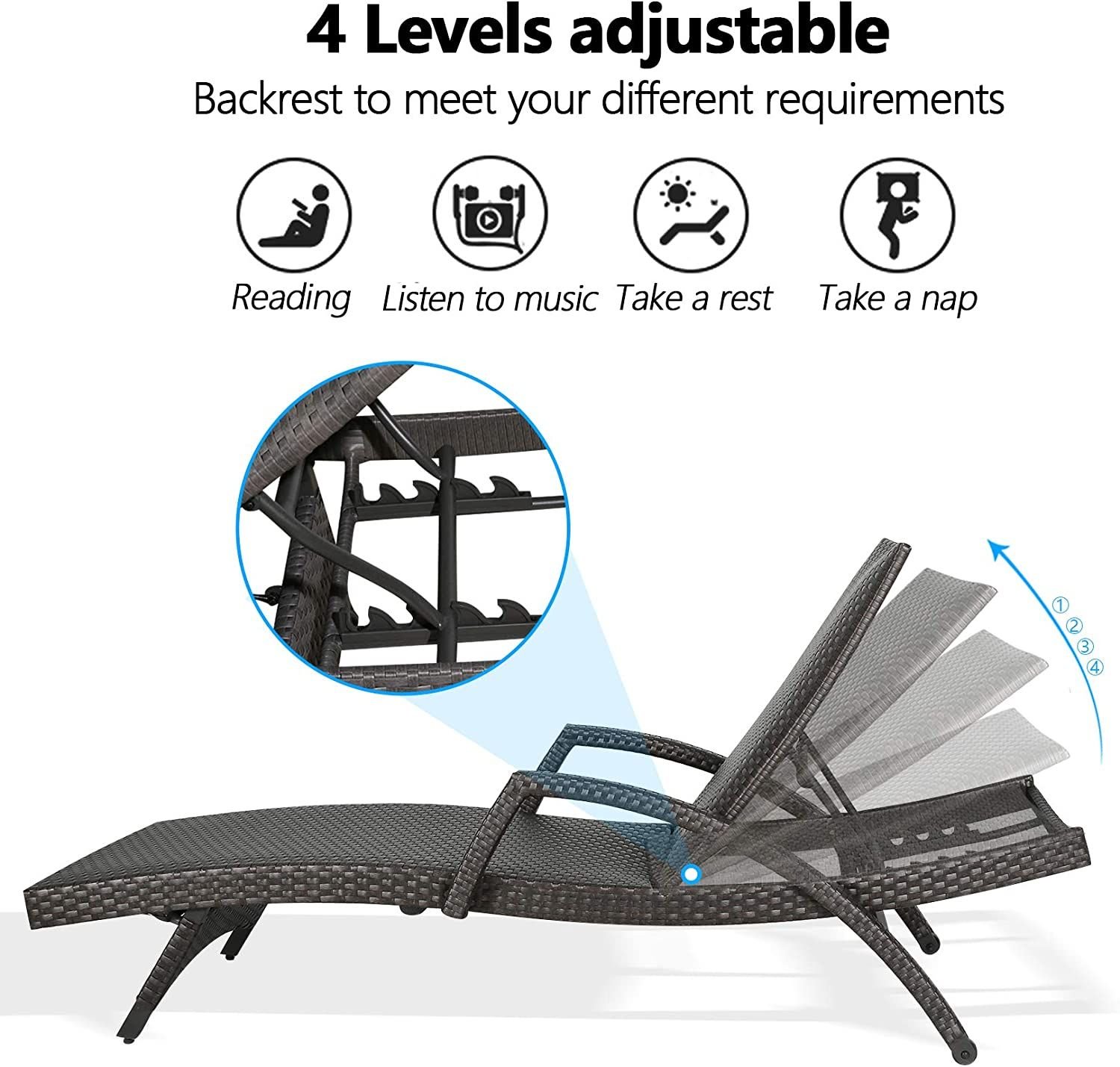 Our patio comfortable rattan chaise lounge chairs are the perfect perch for patio use. The sturdy steel frame on these patio lounge chairs are powder-coated, which is rust-resistant and long-term use. Compared with natural rattan, our environmentally friendly PE rattan has the advantages of smooth surface, weather-resistant and easy to clean. The ergonomic design is for comfort to sit, lean back or lay down. The entire seat and back of this chaise is padded with quick dry, resilient and soft foam under the all-weather weave to create the ultimate in comfort. In addition, there are 4 different backrest positions, you can adjust the back according to your need, enjoy the comfort of different angles. The widened armrest can support and rest your hands to relieve the pressure, you can totally slow down and enjoy the leisure time. The two wheels will help you easily move your chaises and labor-efficiently to the desired place.