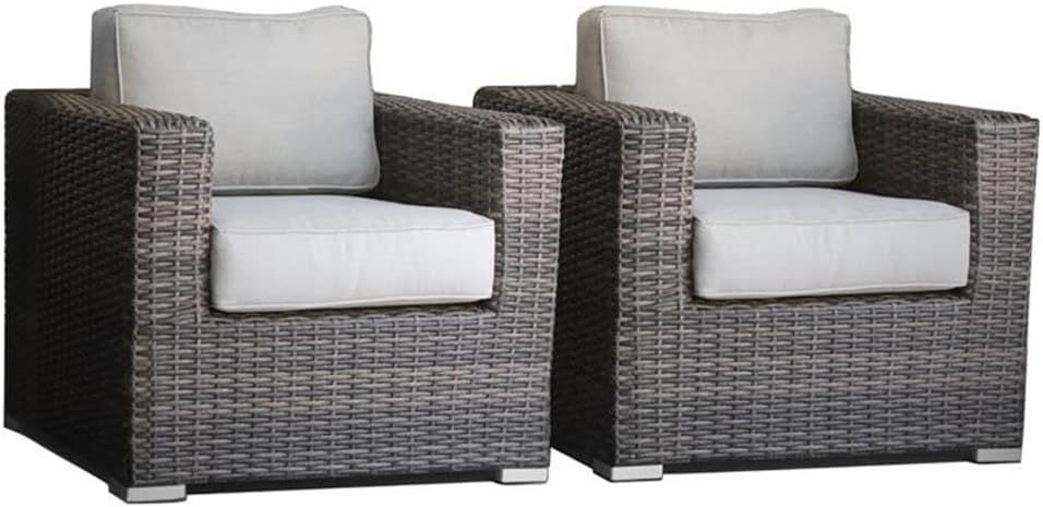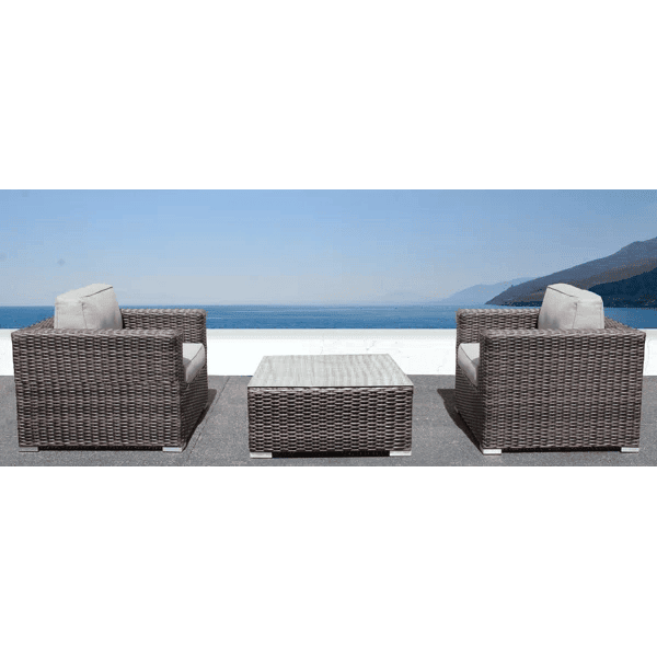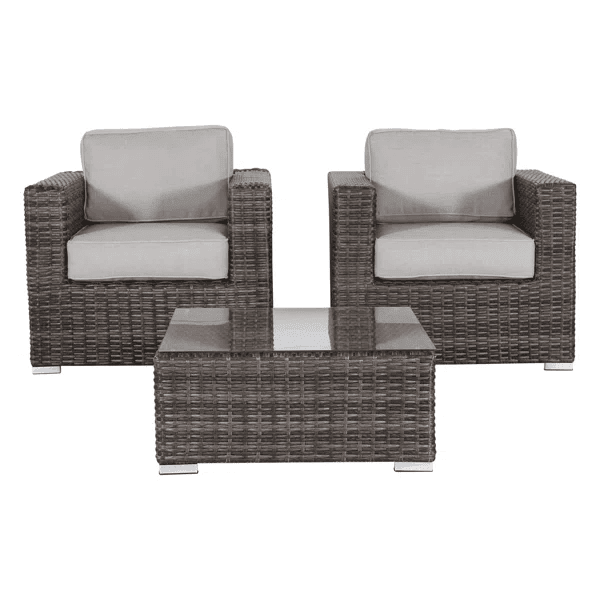 Create a stylish and comfortable outdoor retreat with this 3-piece seating group, designed to accommodate two people. This set includes two deep-seating club chairs and a coffee table with a sleek tempered glass top. The chairs feature a powder-coated aluminum frame wrapped in all-weather wicker rattan, giving them a natural, textured look that complements any outdoor space. The set also comes with plush Olefin cushions, available in a variety of colors to suit your personal style. The foam-filled cushions offer the perfect balance of comfort and support, and their removable covers make cleaning a breeze.What's Included:4 Cushions1 Coffee Table2 ChairsDimensions:Table: 13" H x 28" L x 28" DChair: 26" H x 33" W x 33" DCushion Thickness: 5" HSeat Height (Floor to Seat): 13" HIndividual Chair Weight: 30 lb.Table Weight: 25 lb.Overall Weight: 85 lb.Features:Pieces Included: 2 chairs, 4 cushions, 1 coffee tableTable Material: Wicker; Metal frame with tempered glass topCushion Material: Olefin fabric with foam filling for comfort and supportDurability: Water-resistant, UV-resistant, mold and mildew resistant, weather-resistantEasy Maintenance: Removable, machine-washable cushion coversSeating Capacity: 2 peopleFrame Material: High-Density Polyethylene (HDPE) Wicker over a durable aluminum inner frameCushion Cover Material: Polypropylene/Olefin fabricAssembly: No assembly requiredWarranty: 1-year product warrantyWhether you're enjoying a quiet morning coffee or entertaining guests, this elegant outdoor seating group adds both comfort and style to your patio, balcony, or backyard.