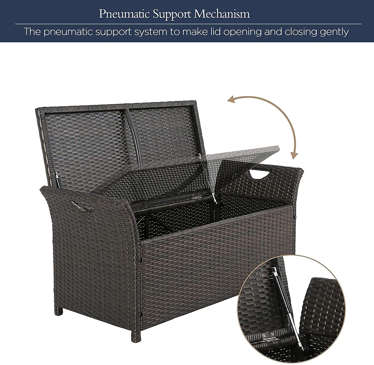 Our all-weather wicker storage bench is durable and functional. It designed with side handle to make you easy to move and carry this deck box. The thick bench cushion also make you more comfortable to sit on it and designed with zipper to detach and clean it easily. Appropriate storage capacity enough to store pool toys, gardening supplies,lawn chair cushions and more. The power-coated steel frame is rust-resistant for long-lasting use. It is wrapped with hand-woven PE wicker, which is weather-resistant and high-quality to add extra fashion. Advanced pneumatic support system to make lids soft open and close gently. It will give you extra seating experience with a flat top surface. You can enjoy the outdoor storage bench in unison with the great outdoors for many years to come.