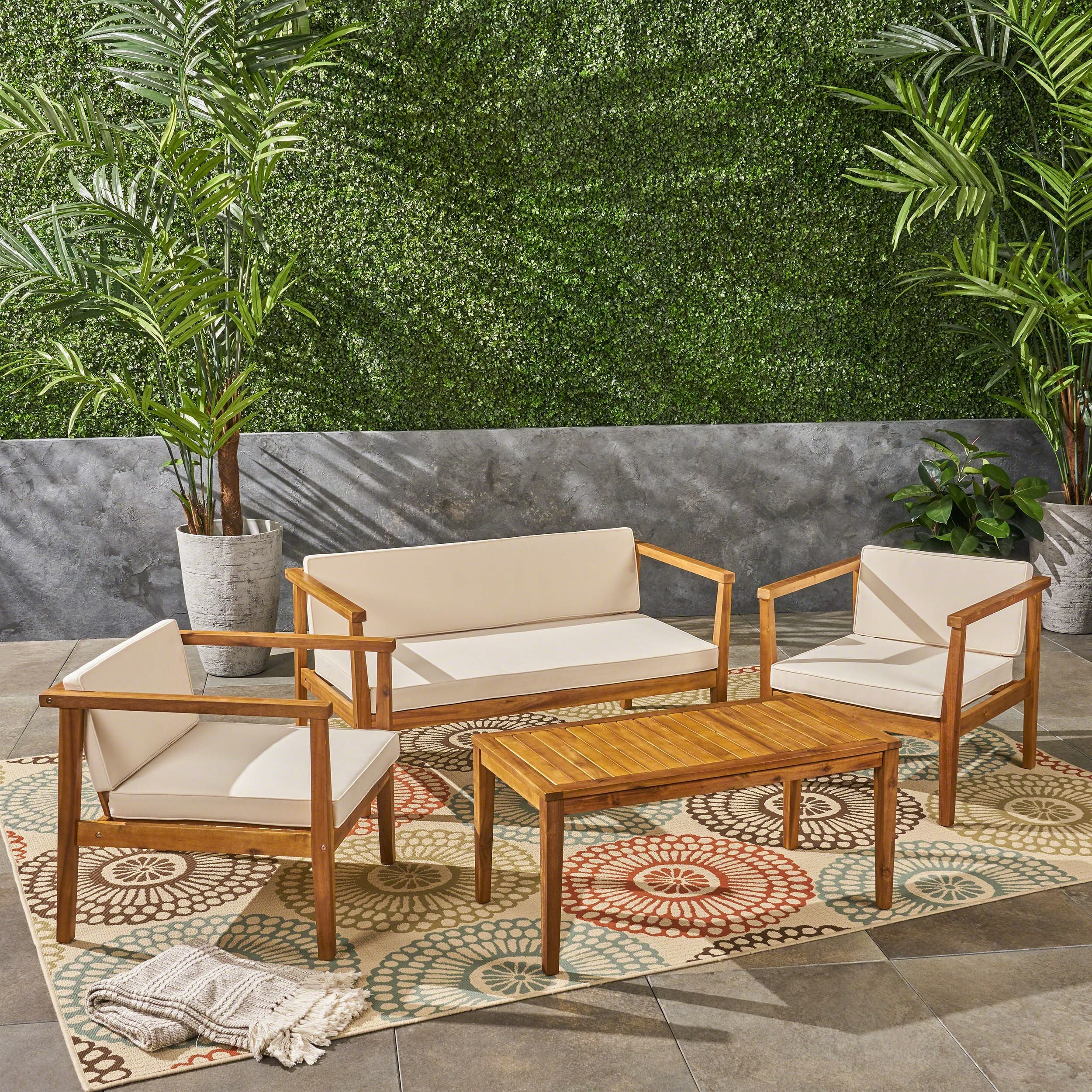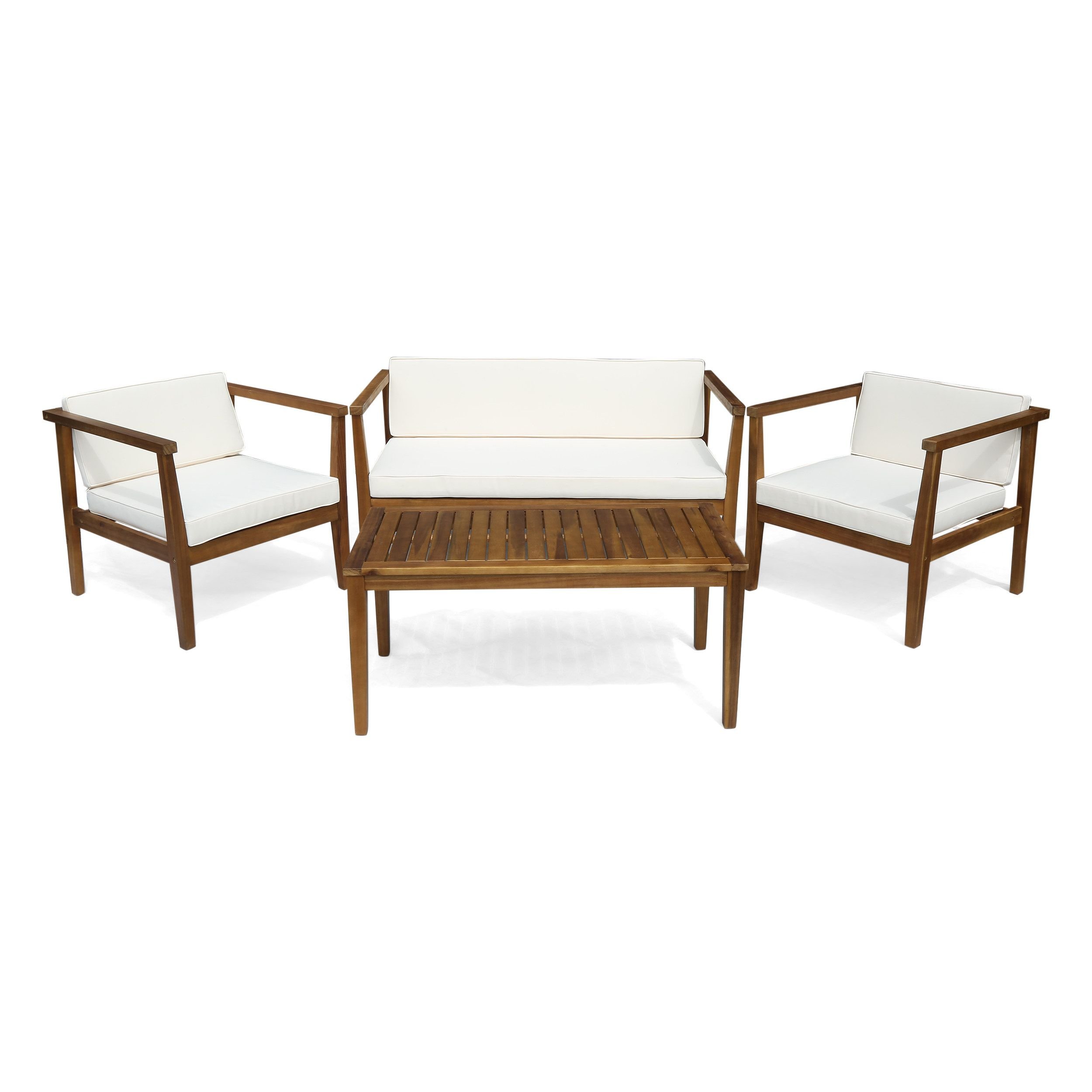 Includes: One (1) Loveseat, Two (2) Club Chairs, One (1) Coffee Table. Frame Material: Acacia Wood. Cushion Material: Water-Resistant Fabric. Fabric Composition: 100% Polyester.