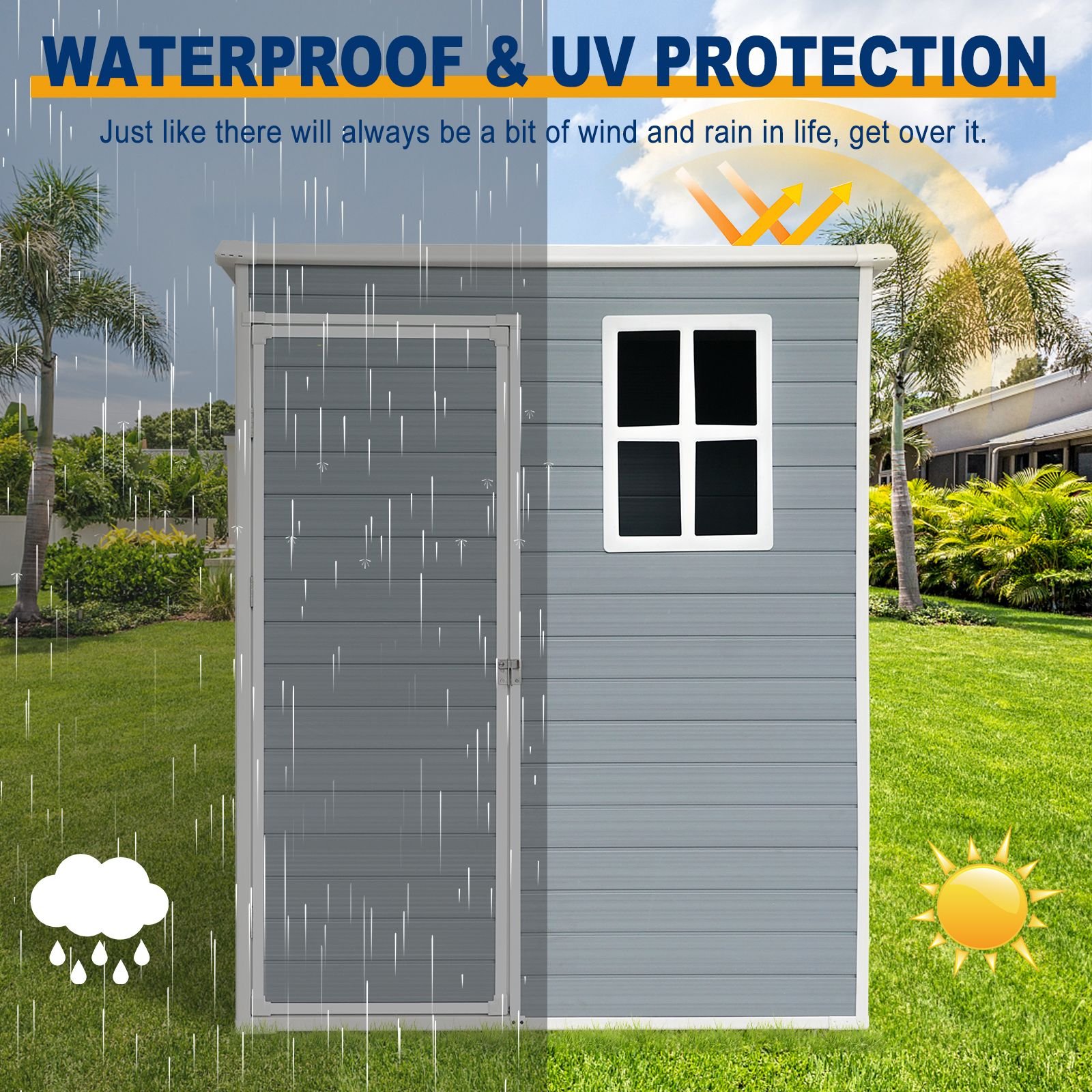 HEAVY-DUTY CONSTRUCTION: Metal reinforced, multi-wall resin panels provide water resistance and UV protection for all-weather durability, while the reinforced resin floor withstands heavy loads.