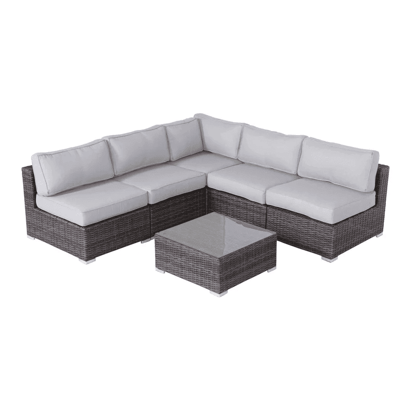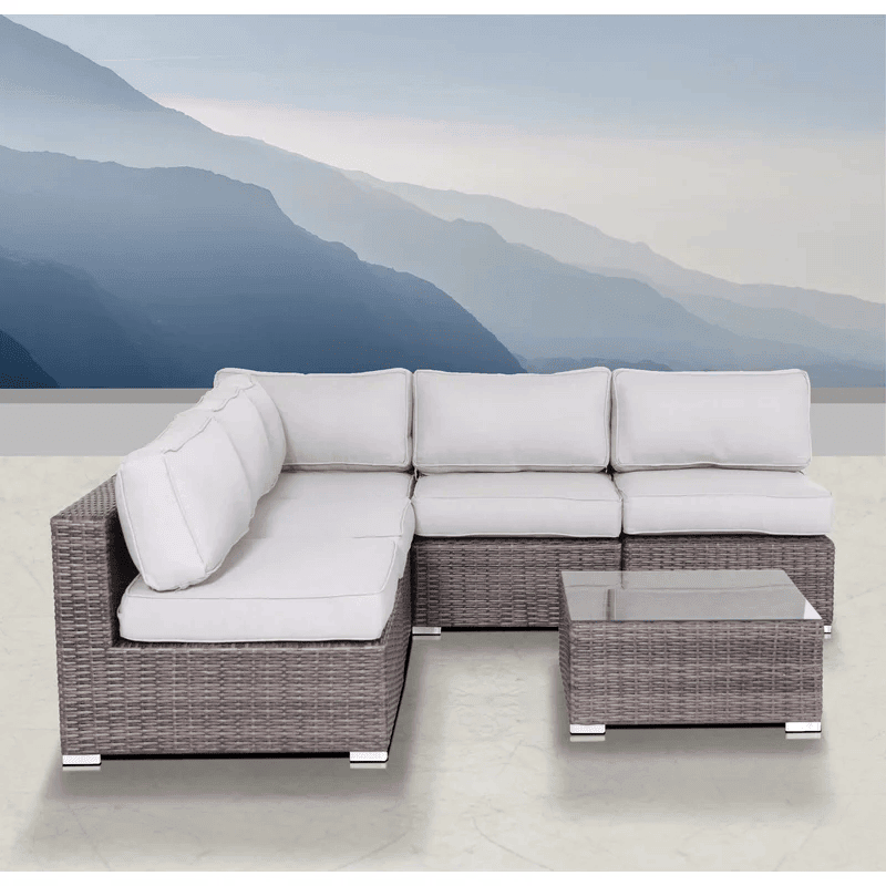 Add style and comfort to your outdoor space with this elegant seating collection. Featuring ultra-soft, plush cushions, this set combines aesthetic appeal with practical functionality. Handcrafted from durable wicker, the modern design will elevate any patio or porch. With its sturdy aluminum frame and water-resistant, UV-resistant cushions, this set offers both beauty and long-lasting durability. Best of all, it comes fully assembled—ready to use right out of the box.What's Included?11 Cushions1 Sofa1 Sectional Piece1 Coffee TableFeaturesGently sloped back for enhanced comfort and supportInterlocking clips for secure sectional arrangementSpecificationsSofa Dimensions: 26" H x 89" W x 89" DTable Dimensions: 13" H x 28" L x 28" DSectional Dimensions: 26" H x 33" W x 33" DCushion Dimensions: 5" HOverall Weight: 171 lbs.Sofa Weight: 151 lbs.Table Weight: 20 lbsIncluded Pieces1 Sofa1 Sectional Piece1 Coffee Table11 CushionsTotal Number of PiecesMaterials & DurabilityFrame Material: High-Density Polyethylene (HDPE) WickerCushion Material: Polypropylene / Olefin with foam fillingTable Material: Wicker base with glass topDurability: Rust-resistant, UV-resistant, weather-resistant, and water-resistantCushion Durability: Water and UV resistantProduct CareMachine washable cushion coversEasy to clean with soap and waterAssemblyNo assembly required
