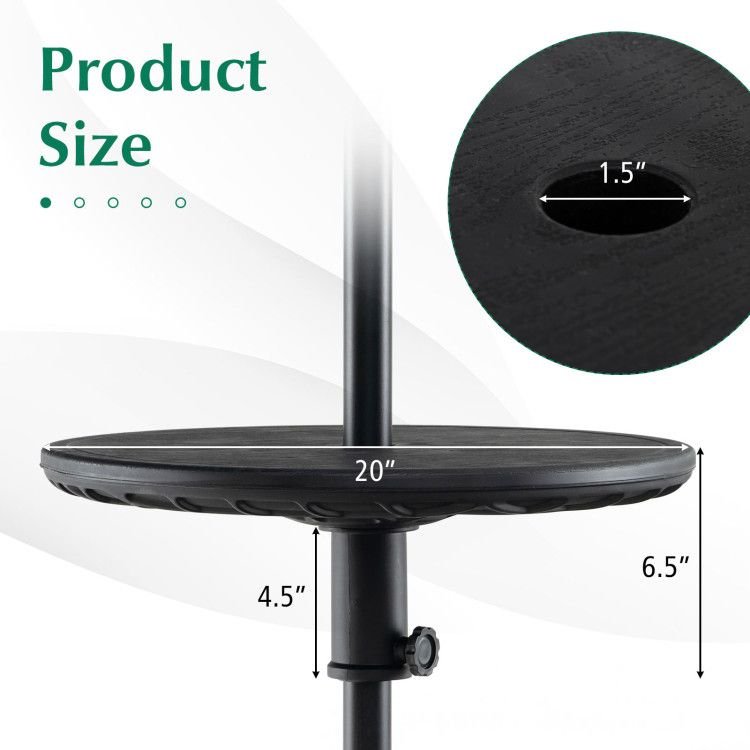 1.Wide and Height Adjustable Design: The 20" umbrella table provides sufficient space to keep your drinks, phone and snacks in place. Equipped with an adaptor to tighten the umbrella, the patio umbrella tray fits the patio umbrella with 1.5" pole. In addition, you can set the round table tray at any height you prefer.